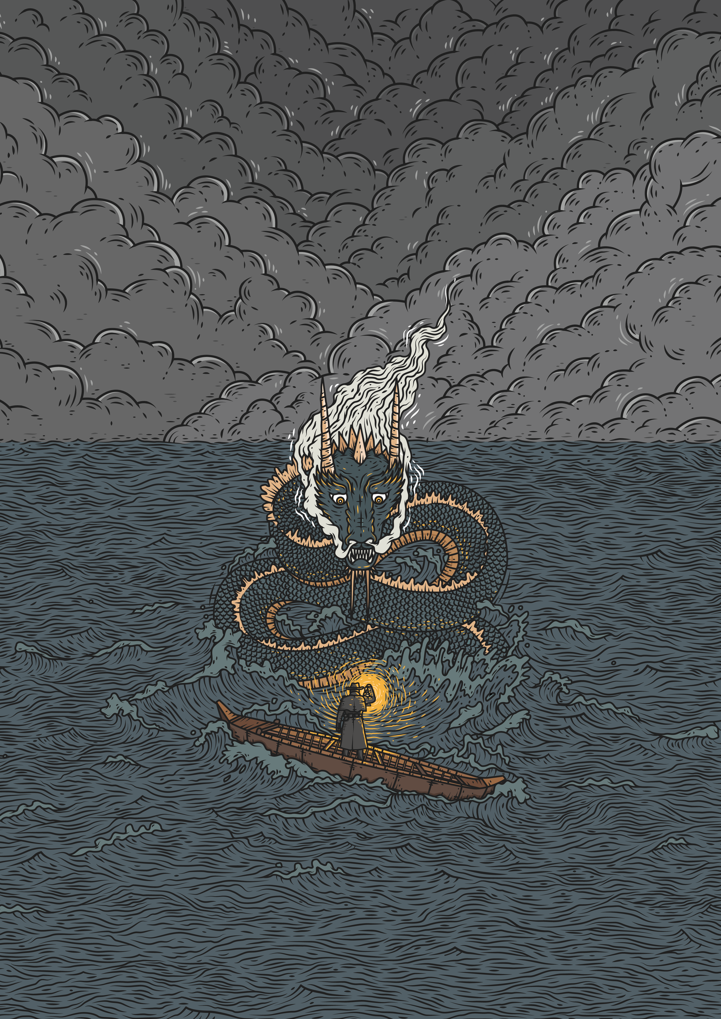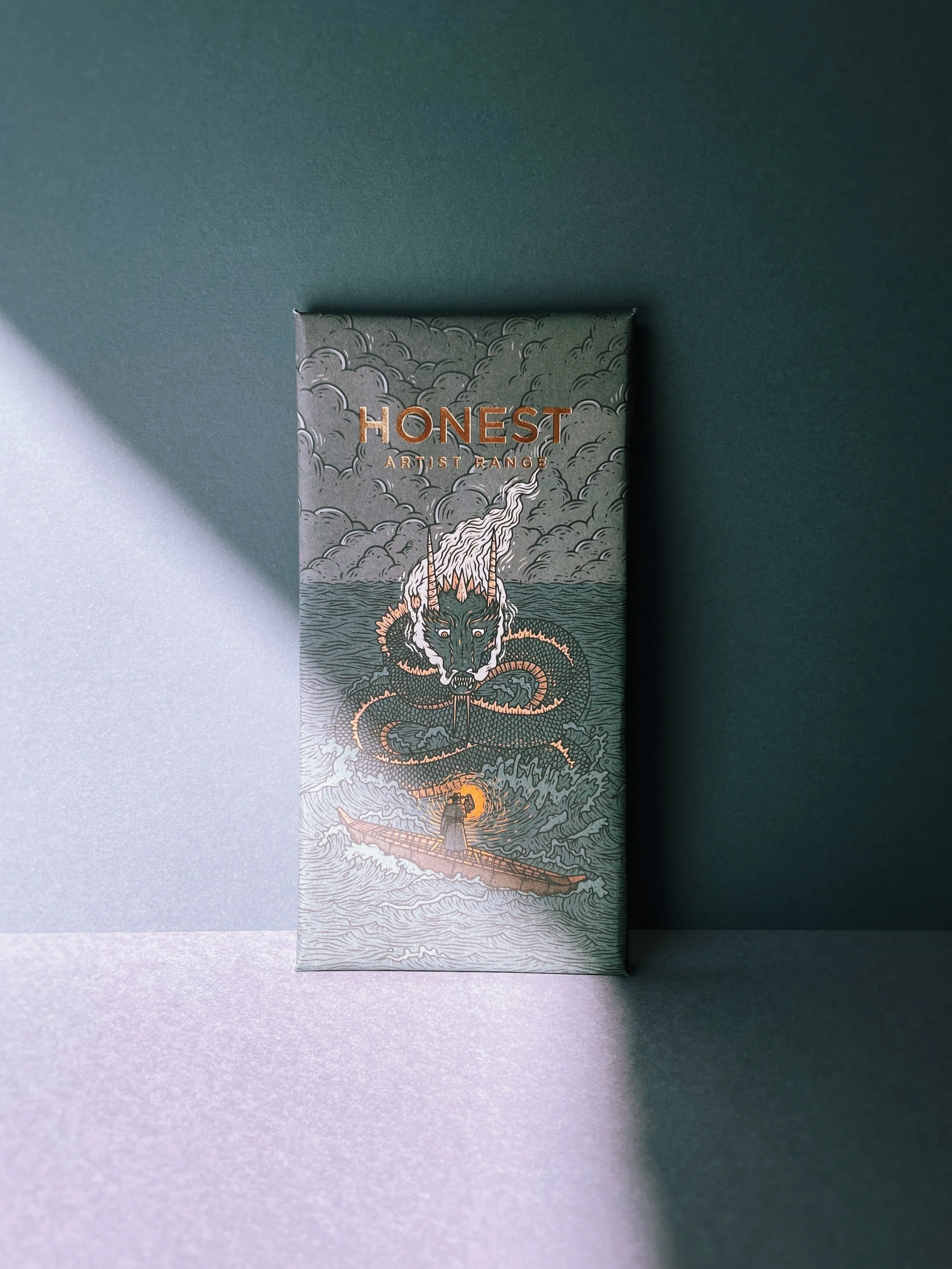 The chocolate that I was asked to do an illustration for was Miso and Tamari Sunflower Seeds in 70% Dark Chocolate with unrefined sugar cane. The chocolate takes inspiration from umami and Japanese flavours and I wanted to incorporate that into my design somehow. A Sea Dragon seemed to be a good fit for those salty taste profiles and the man in the longboat holding up the lantern brought in the “Don’t Be Afraid Of The Dark” slogan that Honest lives by.